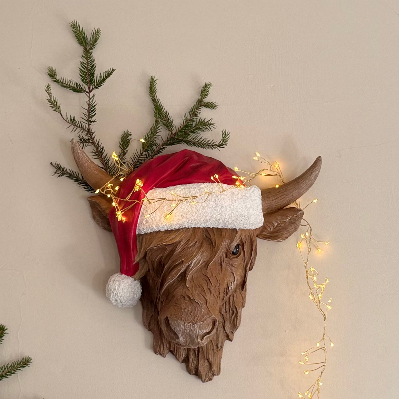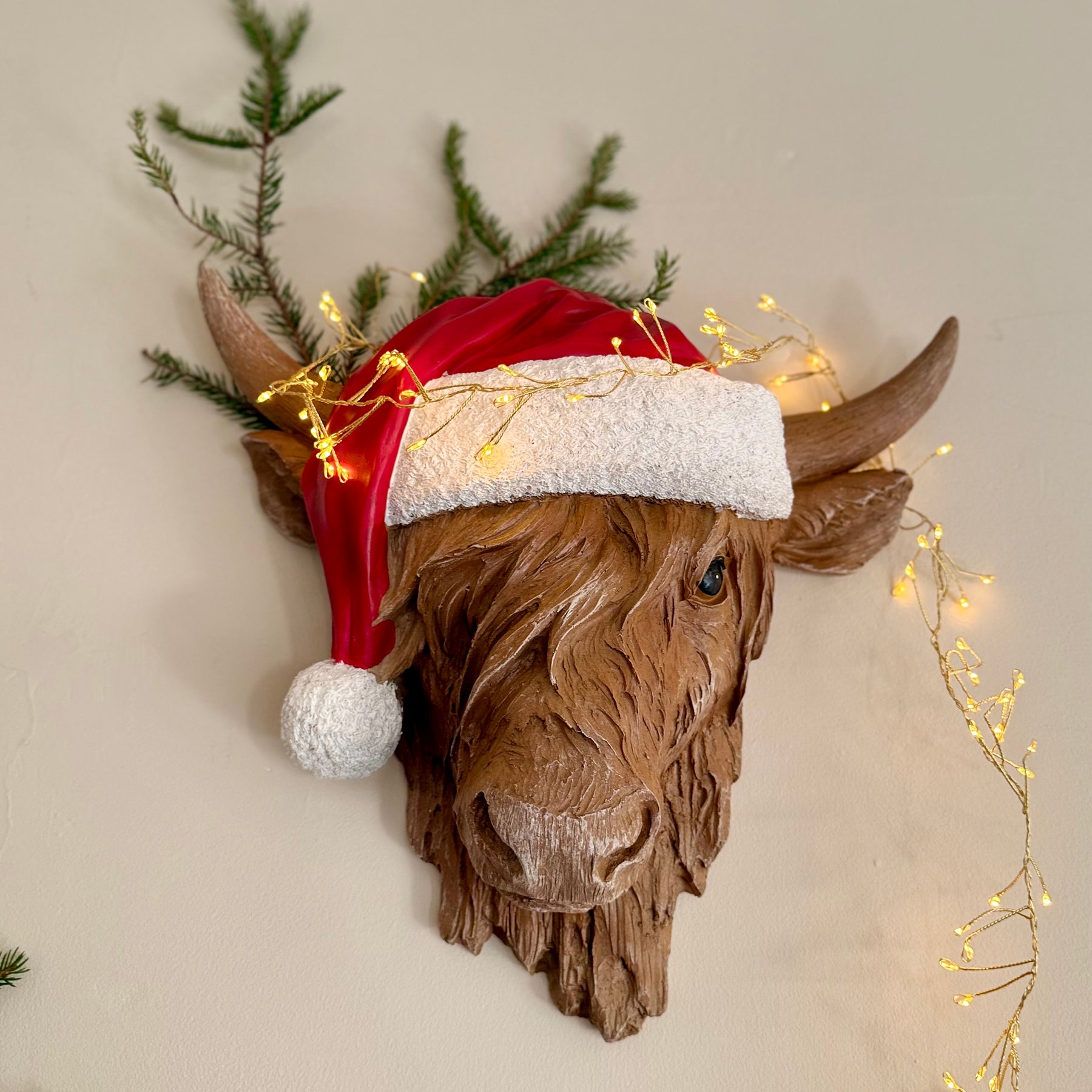 We think our Highland Cow in a Santa Hat is the ultimate Christmas showstopper! With his textured coat, gentle eyes and that perfectly jaunty red Santa hat, he’s here to bring a touch of farmyard humour and festive warmth to your home.