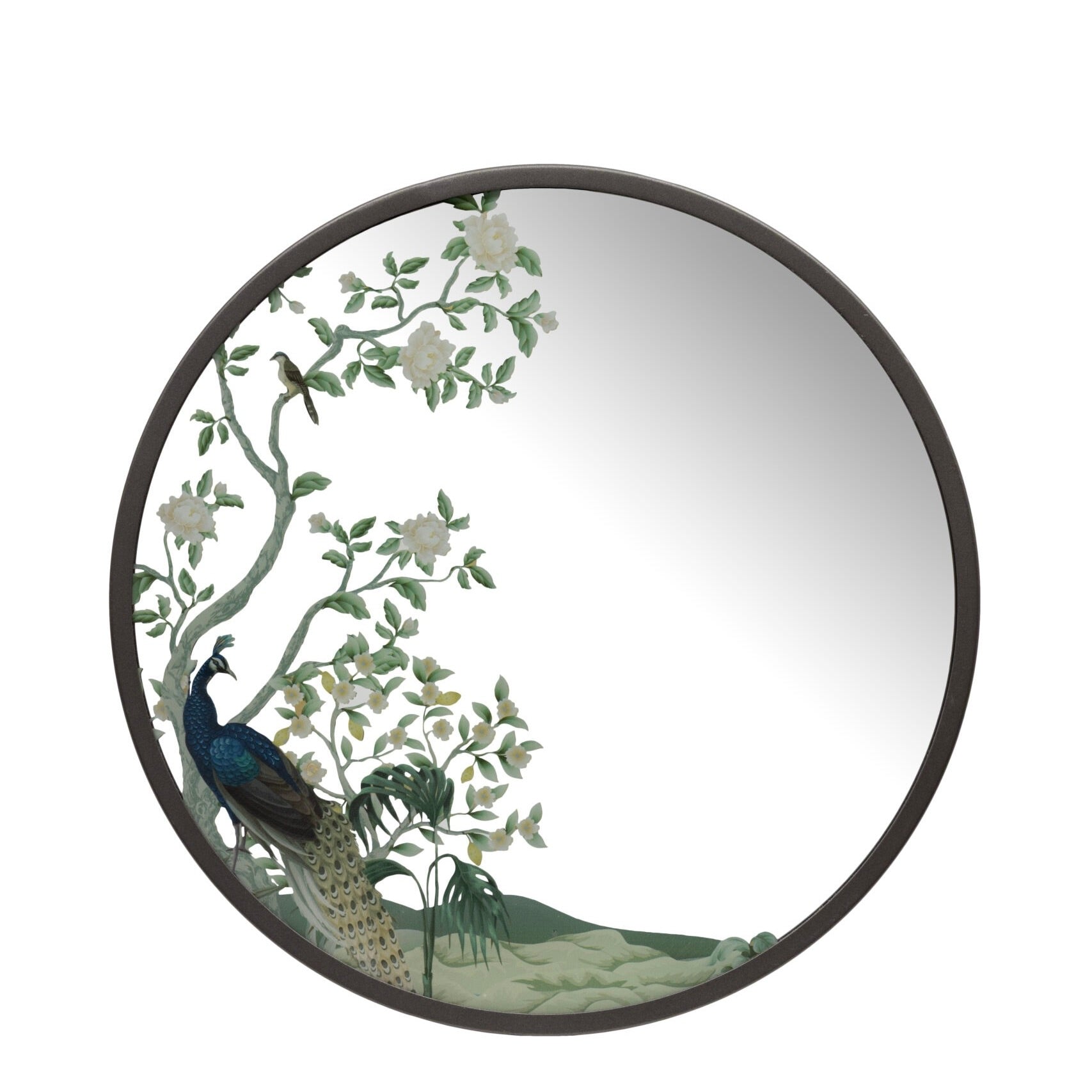 Make a statement with this beautifully detailed round mirror, featuring a serene peacock and floral branch design printed onto the glass for a delicate, watercolour look.
