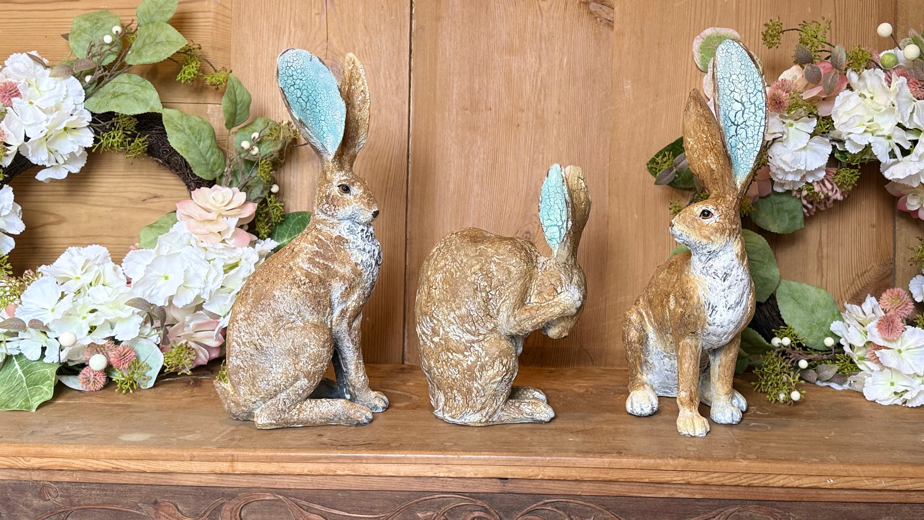 Gorgeous sculpted resin hare with a rustic, textured finish. Standing at 41cm tall, this larger ornament is full of whimsy and character. We especially love the hare’s ears, held upright to show off their beautiful pale turquoise blue crackle finish.